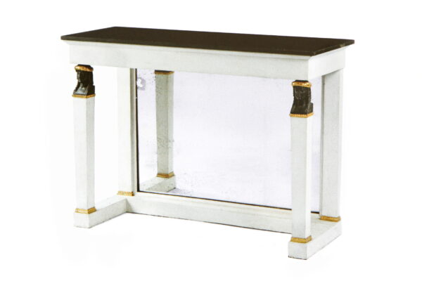 Consola estilo imperio pintada en blanco con detalles en bronce y dorado.