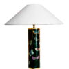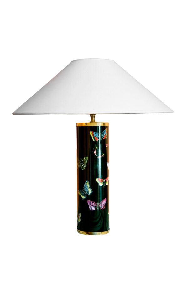 Lámpara de mesa diseño Piero Fornasetti con cuerpo cilíndrico negro decorado con mariposas.