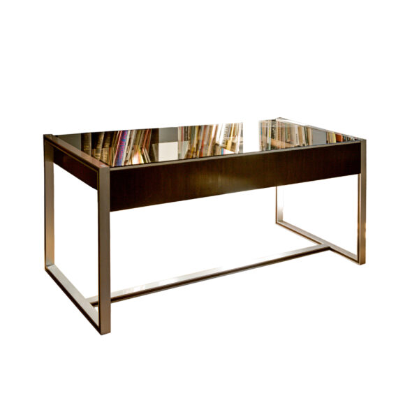 Mesa de despacho acero pulido, con tapa de cristal ahumado y bandeja lateral extraíble.